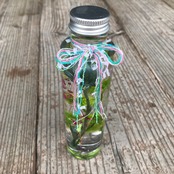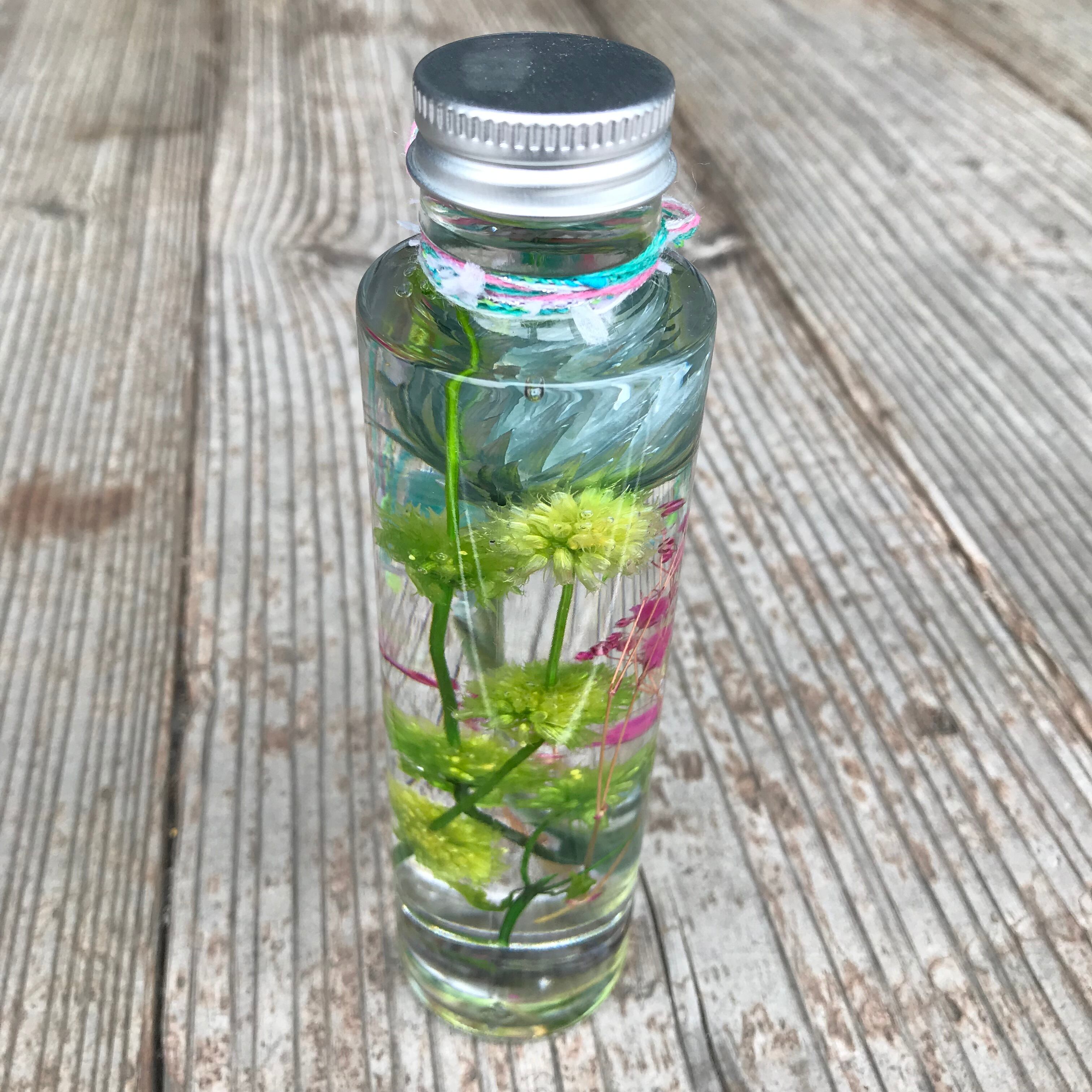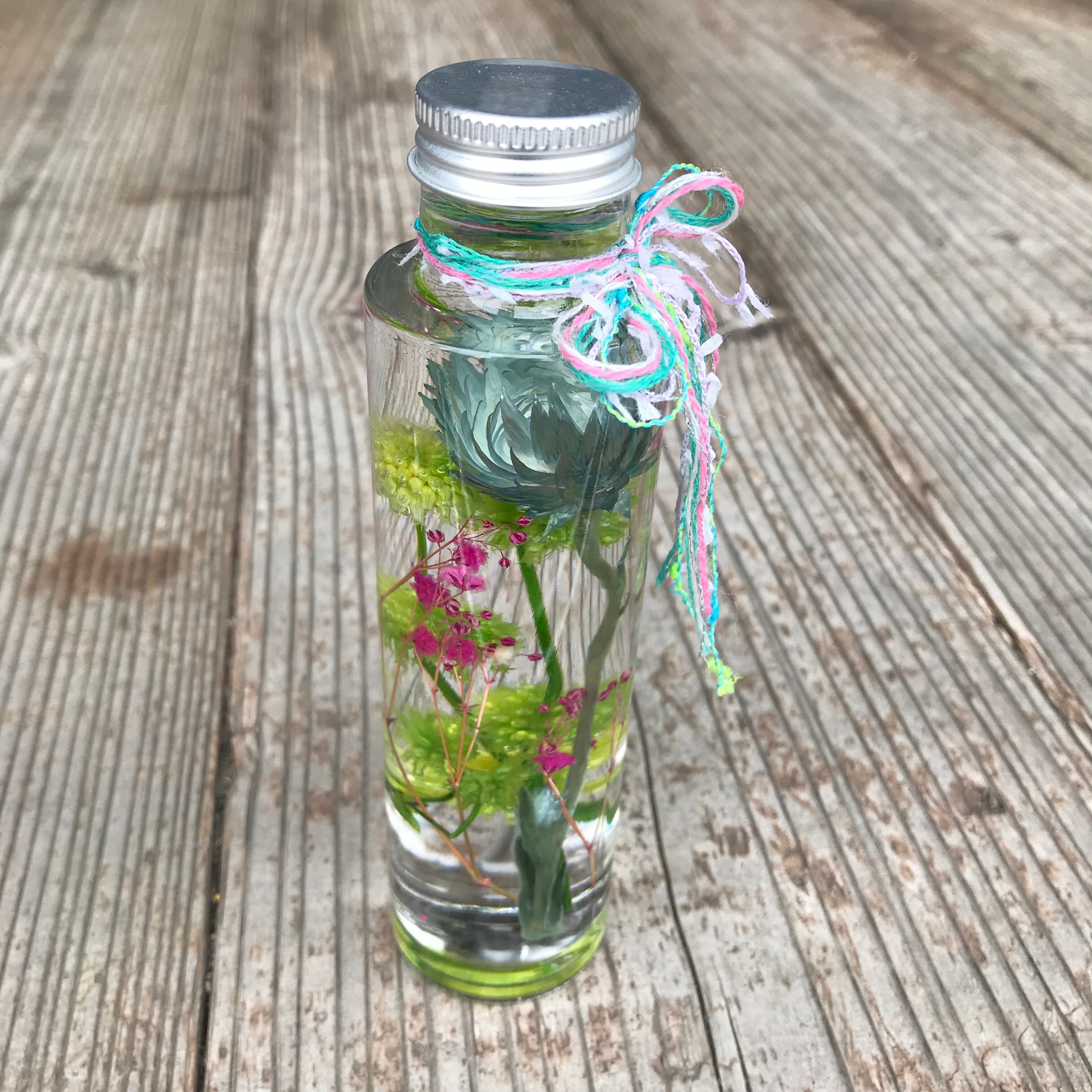 瓶の中の植物はハーバリウム専用のオイルに浮いている状態です。