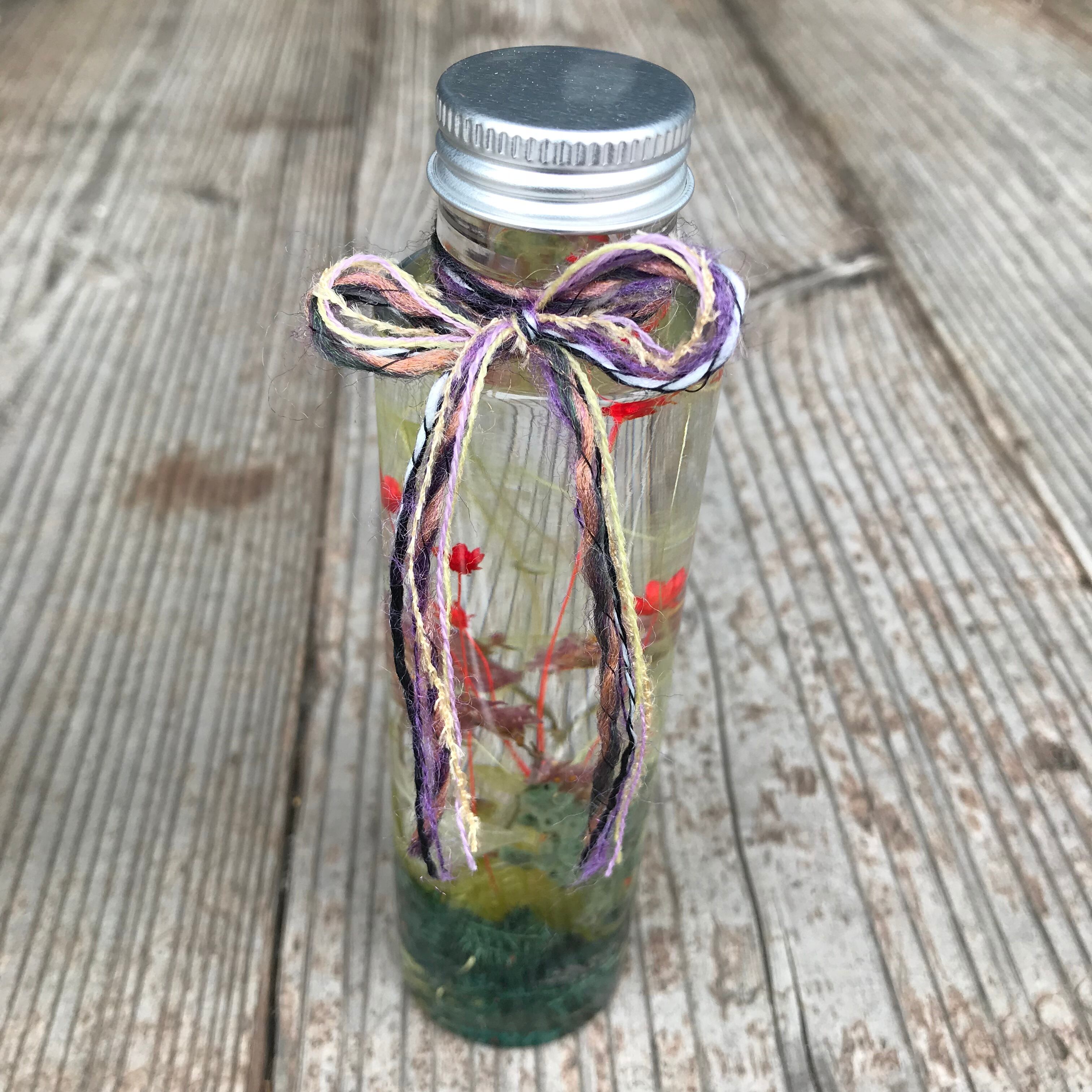 瓶の中の植物はハーバリウム専用のオイルに浮いている状態です。